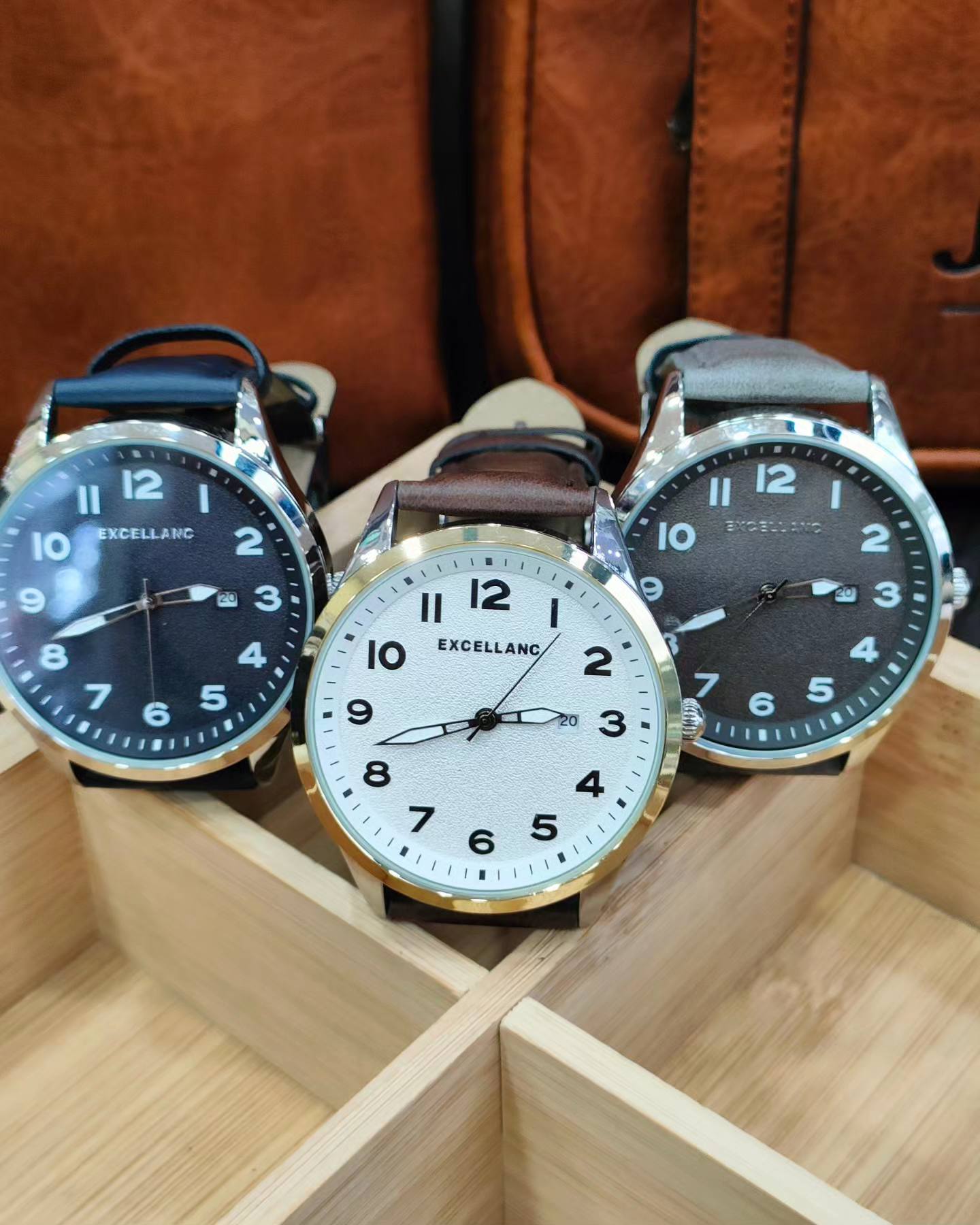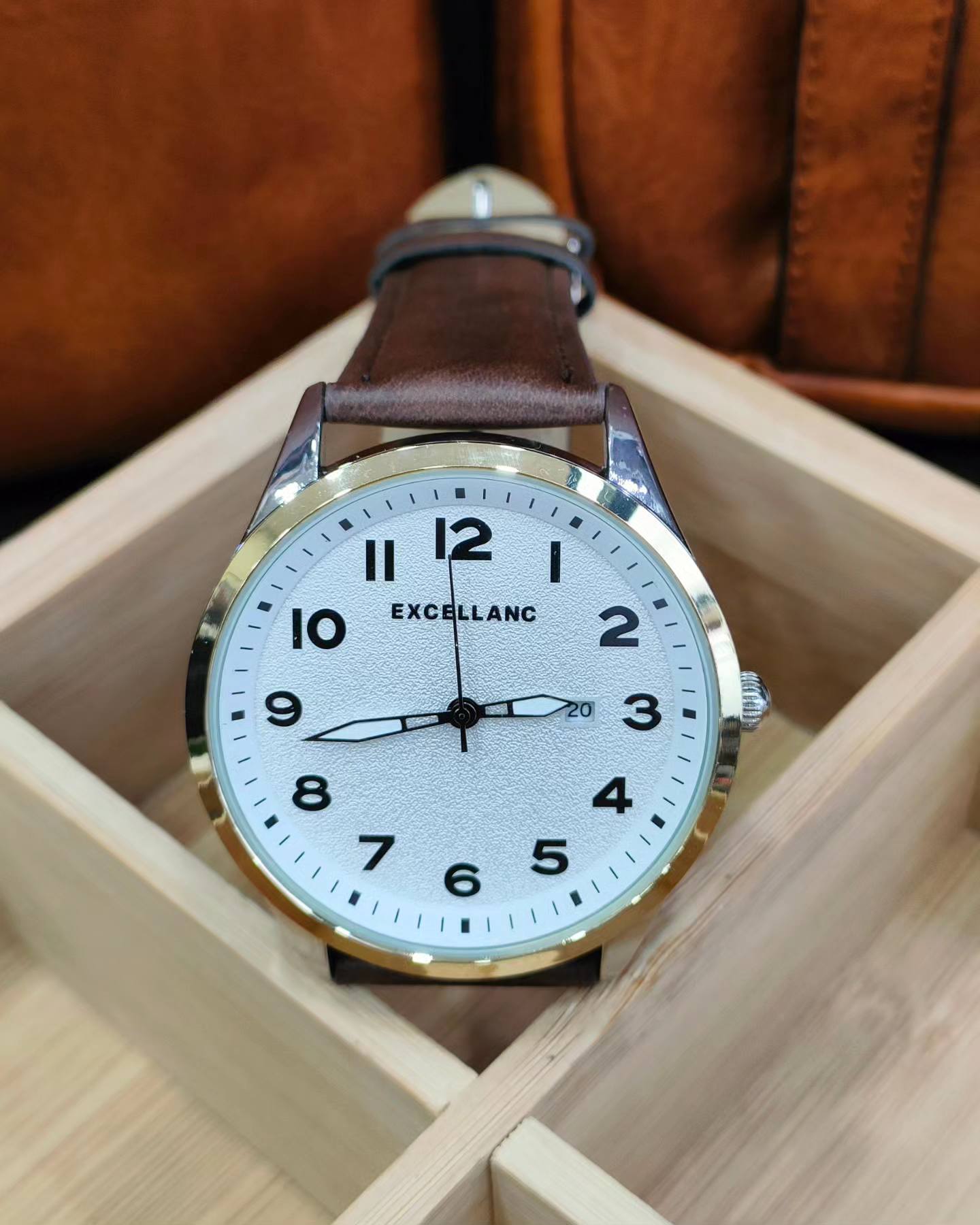 Ανδρικό Ρολόι χειρός EXCELLANC με δερμάτινο λουράκι σε καφέ χρώμα,πλαίσιο σε χρυσό χρώμα και καντράν σε λευκό χρώμα.