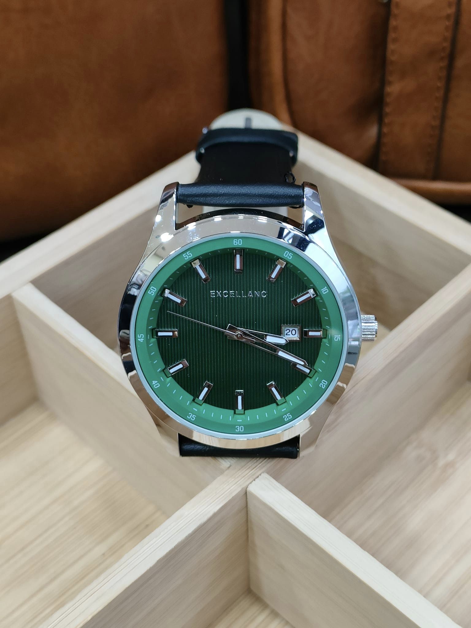 Ανδρικό Ρολόι χειρός EXCELLANC με δερμάτινο λουράκι σε μαύρο χρώμα,πλαίσιο σε ασημί χρώμα και καντράν σε πράσινο χρώμα.