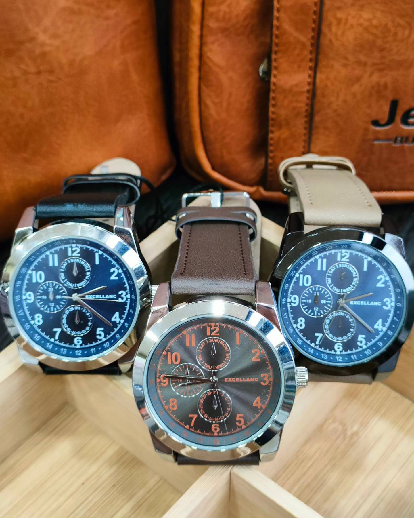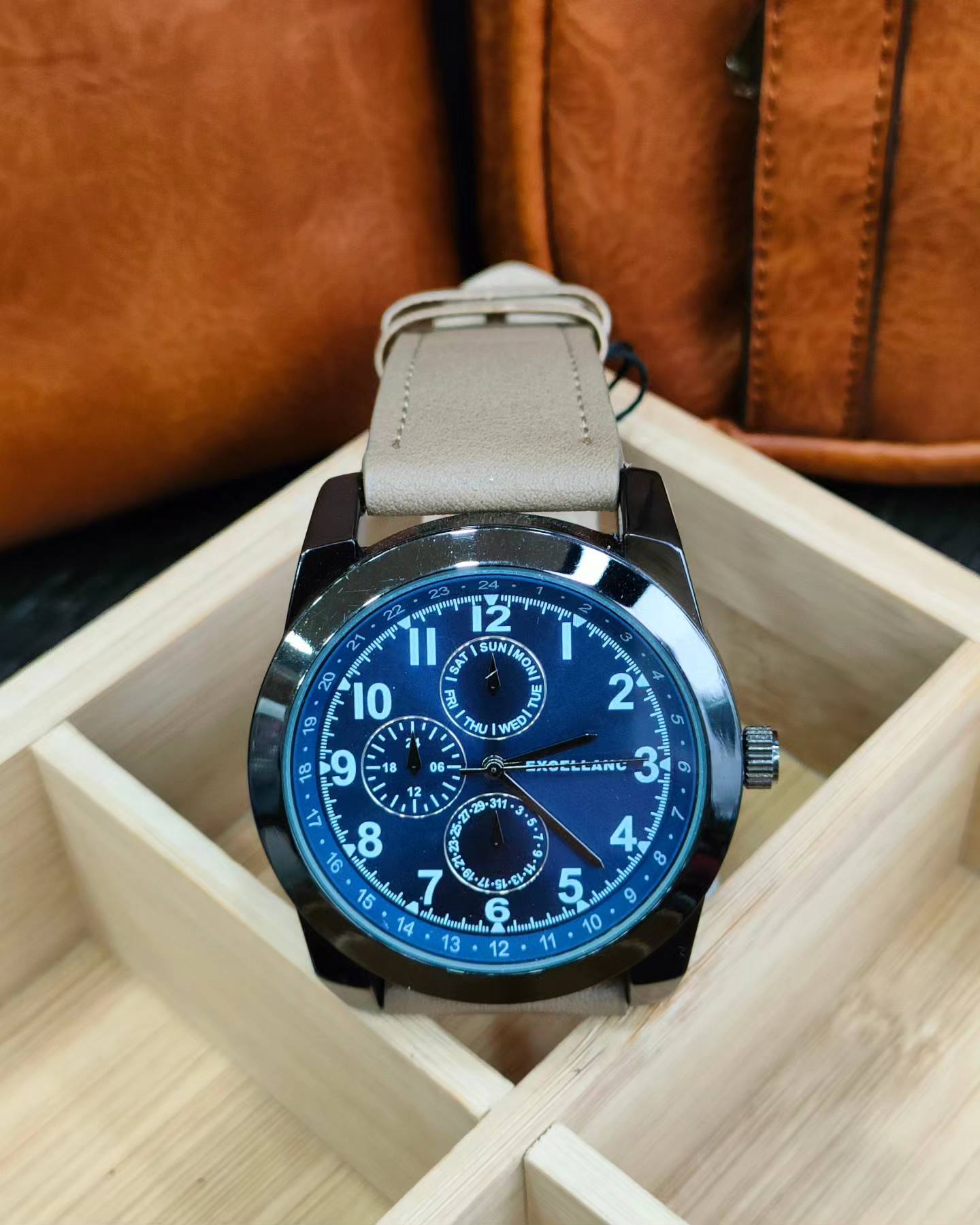 Ανδρικό Ρολόι χειρός EXCELLANC με δερμάτινο λουράκι σε μπέζ της άμμου χρώμα,πλαίσιο σε μαύρο χρώμα και καντράν σε μπλέ χρώμα.