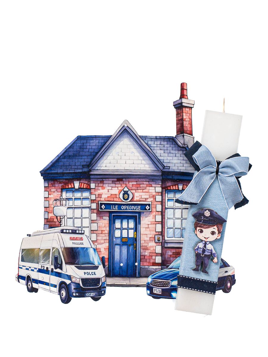 Πρωτότυπη χειροποίητη θεματική πασχαλινή λαμπάδα πλακέ “Αστυνομικός “, σε σετ με ξύλινη βάση που κρεμιέται ως διακοσμητικό καδράκι.