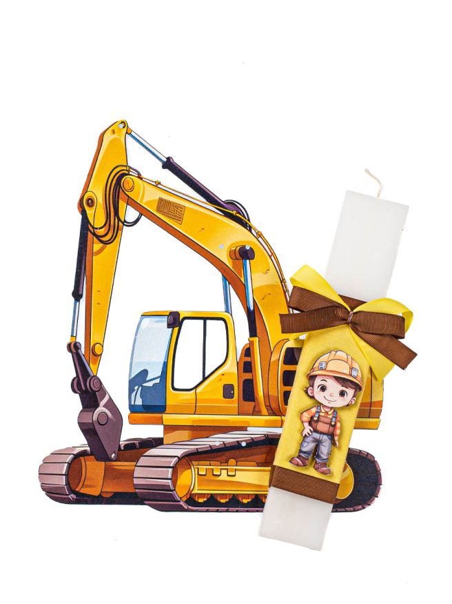 Πρωτότυπη χειροποίητη θεματική πασχαλινή λαμπάδα πλακέ “Έκσκαφέας 2”, σε σετ με ξύλινη βάση που κρεμιέται ως διακοσμητικό καδράκι.