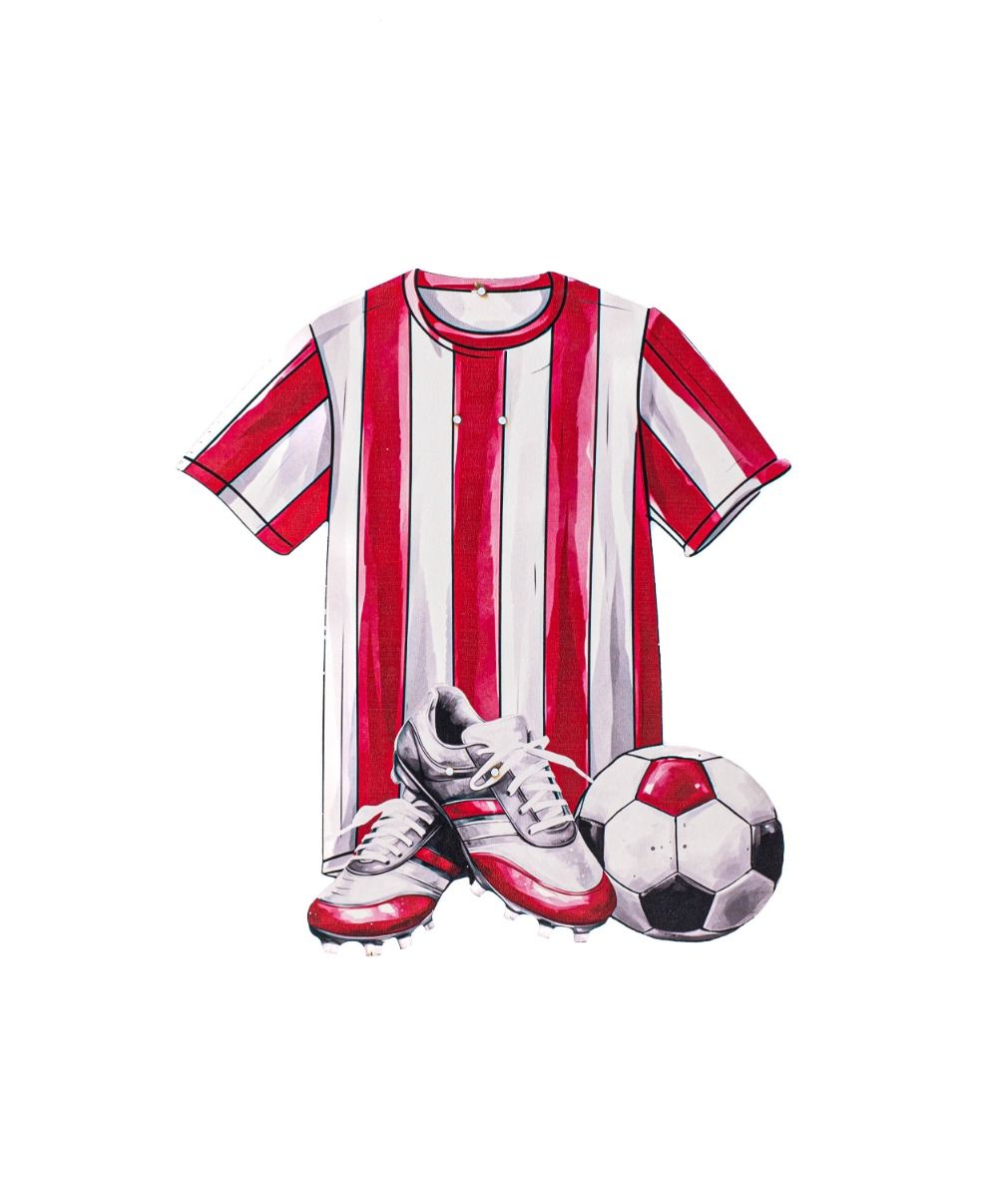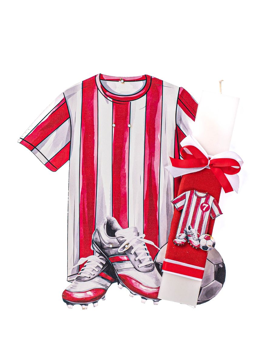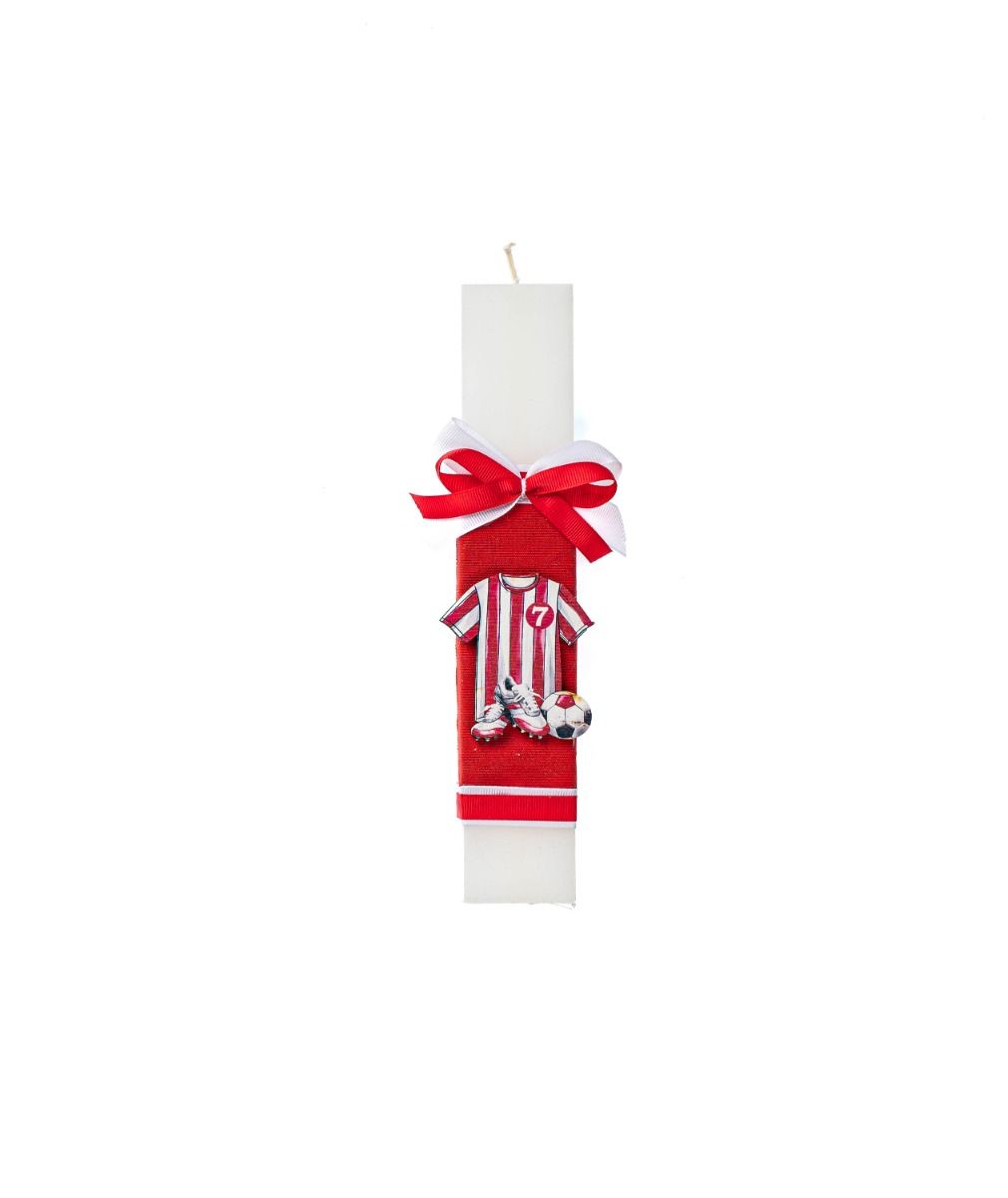 Πρωτότυπη χειροποίητη θεματική πασχαλινή λαμπάδα πλακέ “Football T-Shirt 7”, σε σετ με ξύλινη βάση που κρεμιέται ως διακοσμητικό καδράκι.